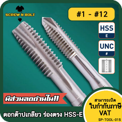 ดอกต๊าปเกลียว ร่องตรง HSS-E รูทะลุ เศษลงล่าง เหมาะงานอลูมิเนียม สังกะสี หุน หยาบ #1 - #12 / UNC Straight Flute Tap