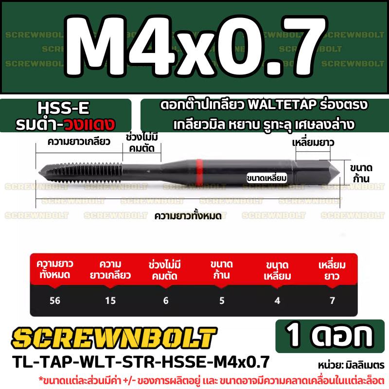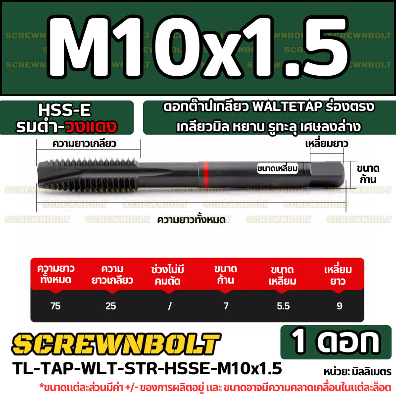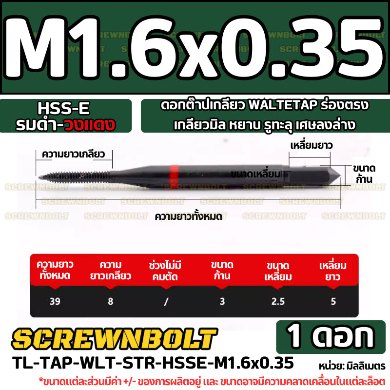 🔍 ชื่อรายการสินค้า : ดอกต๊าปเกลียว WALTETAP ร่องตรง เกลียวมิล หยาบ รูทะลุ เศษลงล่าง HSS-E รมดำ-วงแดง M1.2 - M12