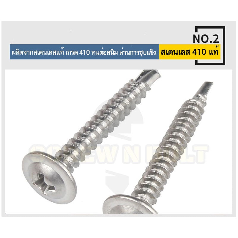 👍 สเตนเลส 410 - ผลิตจากสเตนเลสแท้ เกรด 410 คงทนต่อสนิมได้ดี ผ่านกระบวนการชุบแข็งที่ทำให้สกรูมีความแข็งแรง เจาะผ่านวัตถุดิบเนื้อแข็งได้