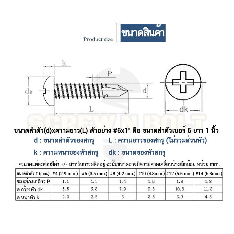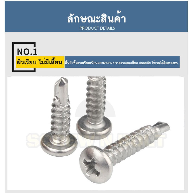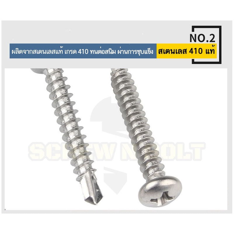 🔍 ชื่อรายการสินค้า : น็อต สกรู หัวกลม หัวแพน แฉก สแตนเลส 410 ปลายสว่าน #8 #10 #12