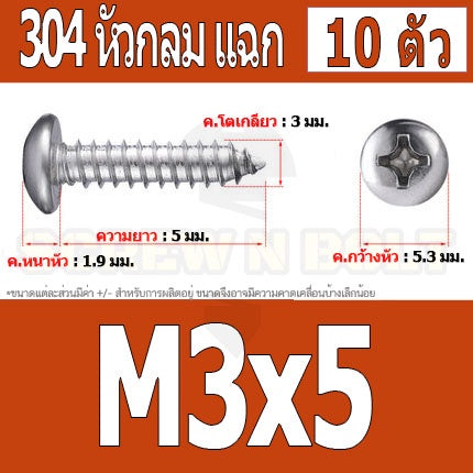 🔍 ชื่อรายการสินค้า : น๊อตสกรูเกลียวปล่อย สแตนเลส 304 หัวกลมแฉก P+ ไซส์ M3