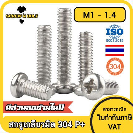 น็อต สกรู หัวกลม แฉก P+ สแตนเลส 304 เกลียวมิล หยาบ M1 M1.2 M1.4 / Pan Head Phillip Machine Screw SUS304 M1 M1.2 M1.4