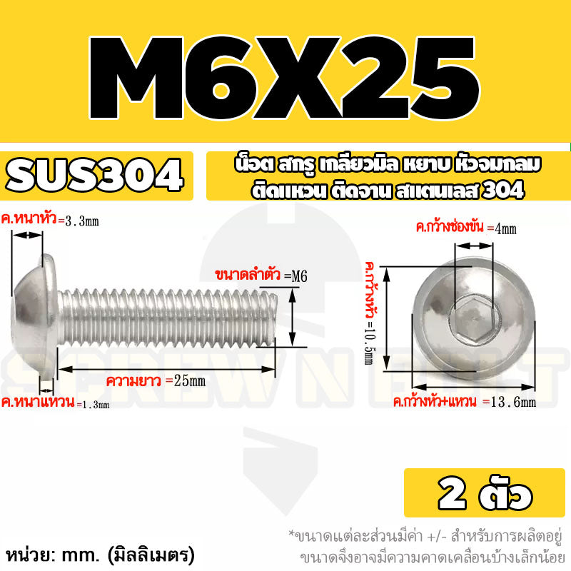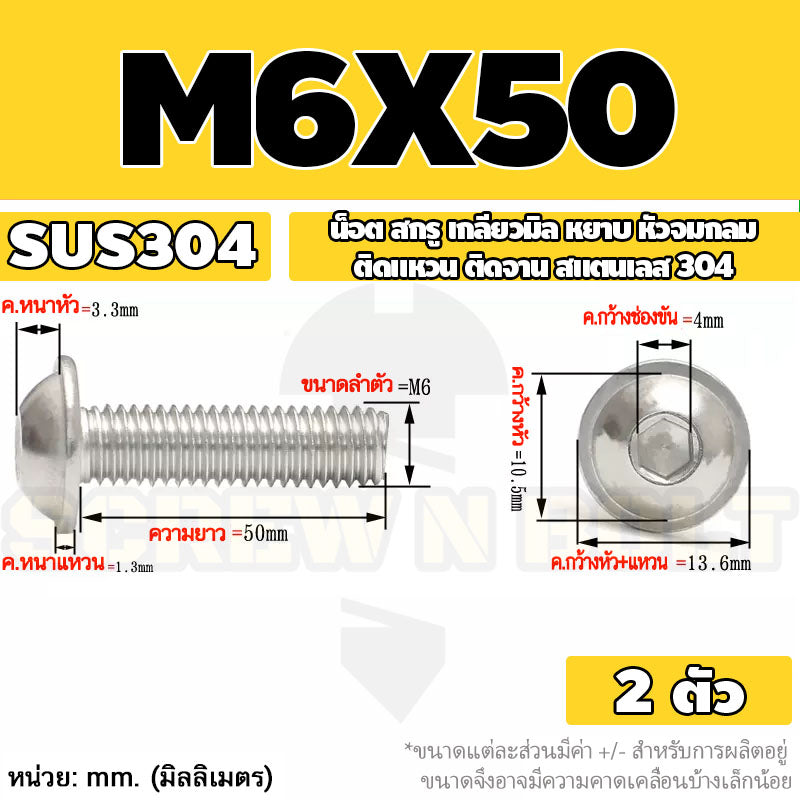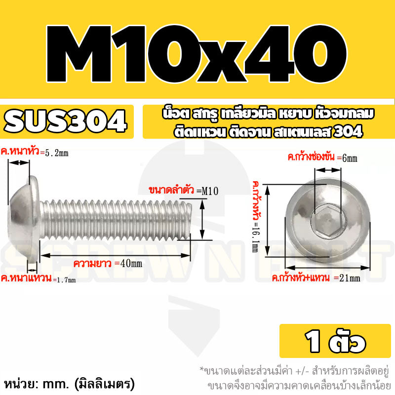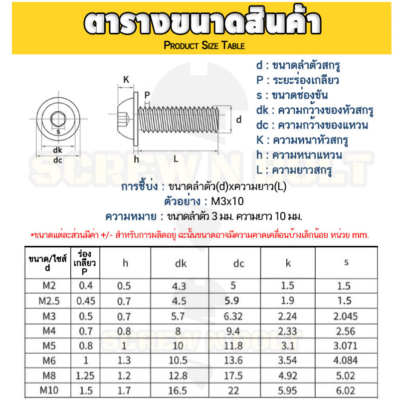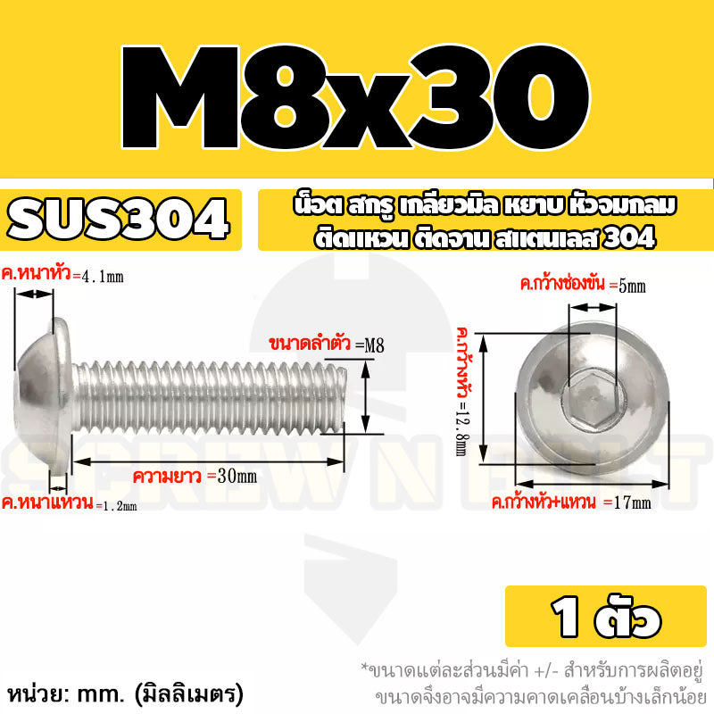 น็อต สกรู หัวจมกลม ติดแหวน ติดจาน สเตนเลส 304 เกลียวมิล หยาบ M6 M8 M10 / Button Head Washer Socket Machine Screw SUS304