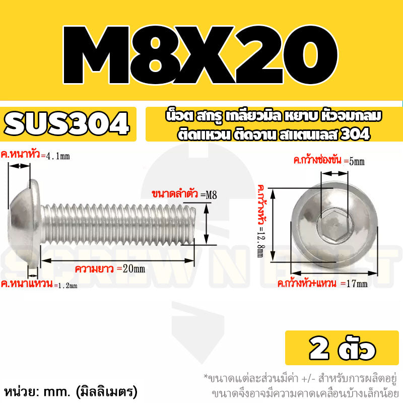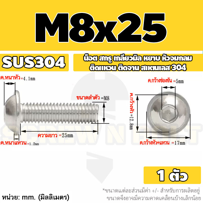 - สกรูเกลียวมิล M8 ใช้คู่กับ หัวน็อตตัวเมีย M8 ที่ใช้ประแจหกเหลี่ยมเบอร์ #12/#13