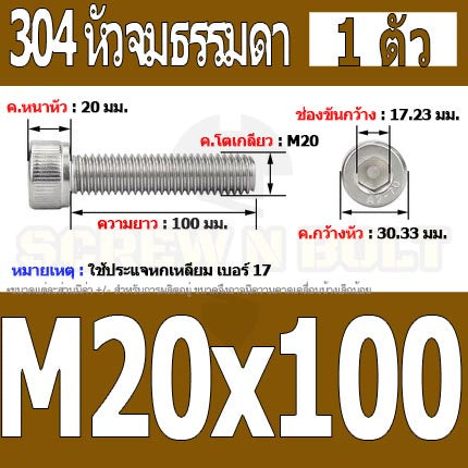 🔍 ชื่อรายการสินค้า : น๊อตสกรูเกลียวมิล สแตนเลส 304 หัวจม ไซส์ M20