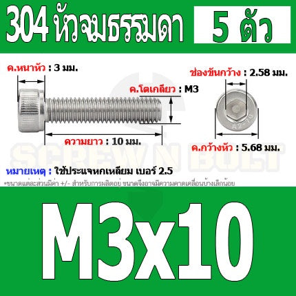 น็อต สกรู หัวจม สแตนเลส 304 เกลียวมิล ตลอด หยาบ M3 / Hex Socket Head Cap Machine Screw SUS304 M3