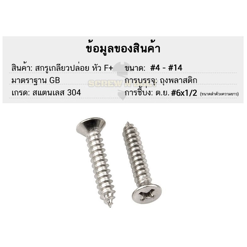 🔍 ชื่อรายการสินค้า : น็อตสกรู หัวเตเปอร์ หัวเรียบ แฉก F+ สแตนเลส 304 เกลียวปล่อย #7