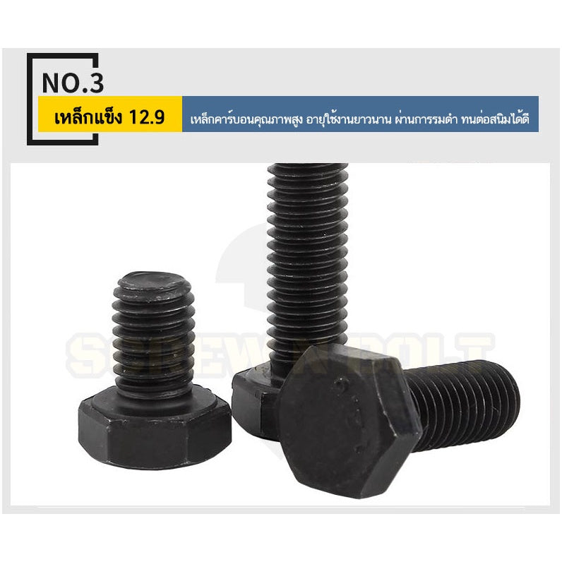 👍 คุณสมบัติเหล็กแข็ง 12.9 - ผลิตจากเหล็กคาร์บอนคุณภาพสูง มีความแข็งสูงระดับ 12.9 มีอายุการใช้งานที่ยาวนาน ผิวผ่านการรมดำเพื่อประสิทธิภาพการใช้งานและทนต่อสนิมได้ดี