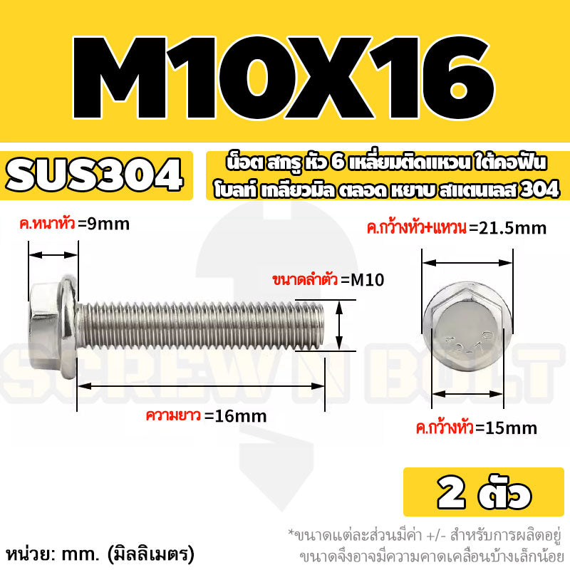 🔍 ชื่อรายการสินค้า : น็อต สกรู หัว 6 เหลี่ยมติดแหวน ใต้คอฟัน โบลท์ สแตนเลส 304 เกลียวมิล ตลอด หยาบ M10 M12