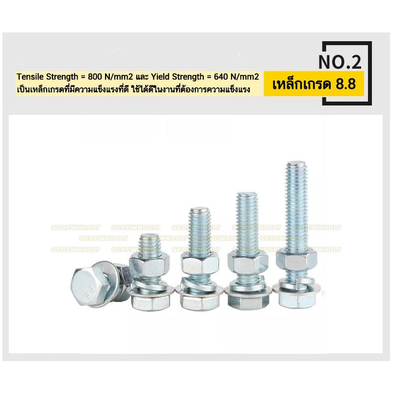 (ยกชุด) น็อต สกรู หัว หกเหลี่ยม แหวน+สปริง+ตัวเมีย เหล็ก 8.8 ชุบ ขาว/ฟ้า มิล หยาบ M14 M16 M18 / (Set) 8.8 Hex Bolt Wh/Zn