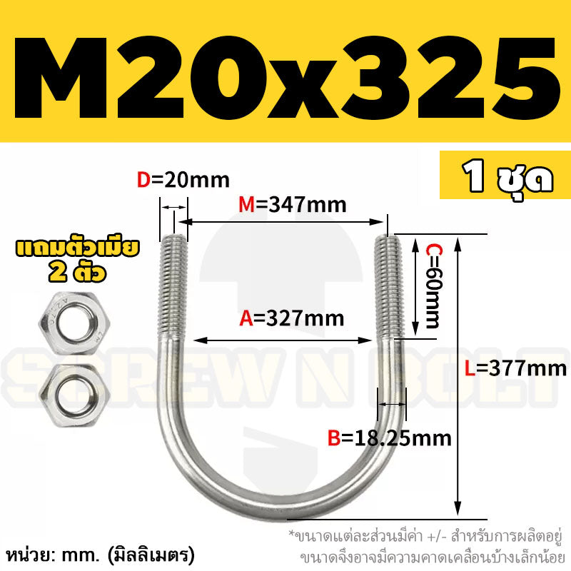 ยูโบลท์ สลักเกลียวตัวยู ยึดจับท่อ สแตนเลส 304 พร้อมตัวเมีย 2 ตัว M20 M24 / U Shape Clamp Bolt /w 2 Hex Nuts SUS304