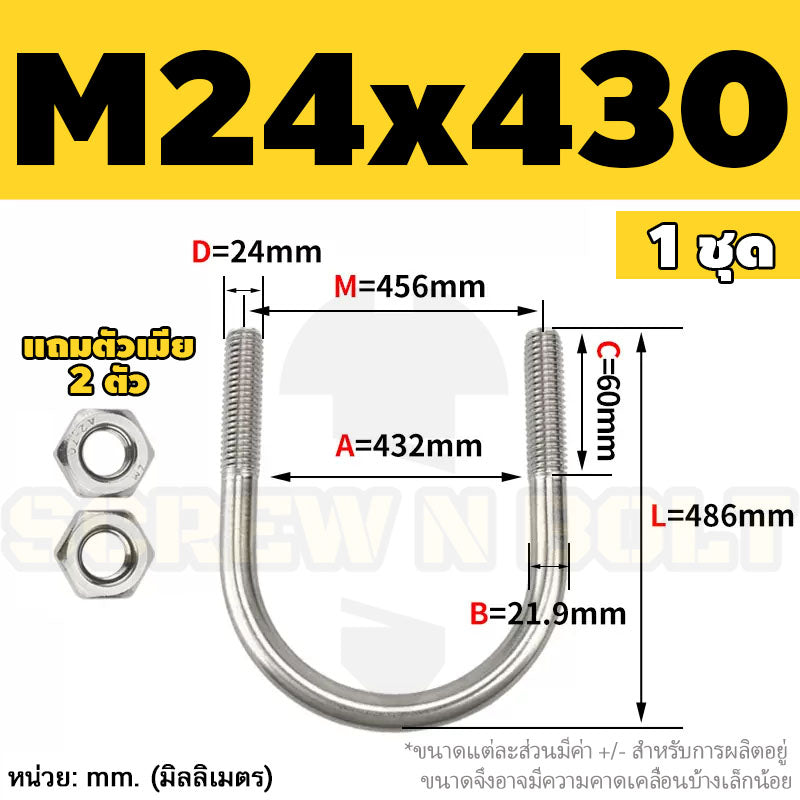 ยูโบลท์ สลักเกลียวตัวยู ยึดจับท่อ สแตนเลส 304 พร้อมตัวเมีย 2 ตัว M20 M24 / U Shape Clamp Bolt /w 2 Hex Nuts SUS304
