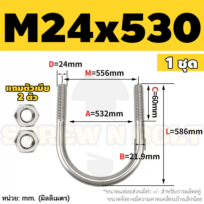 🔍 ชื่อรายการสินค้า : ยูโบลท์ สลักเกลียวตัวยู ยึดจับท่อ สแตนเลส 304 พร้อมตัวเมีย 2 ตัว M20 M24