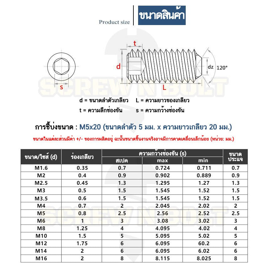สกรู ตัวหนอน หกเหลี่ยม ปลายตัด สแตนเลส 304 เกลียวมิล หยาบ M4 M5 / Hex Socket Set Screw w/ Cup Point M4 M5