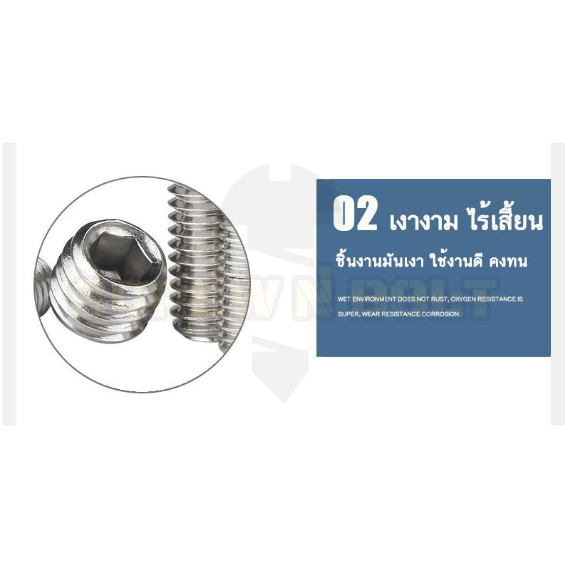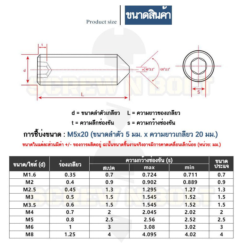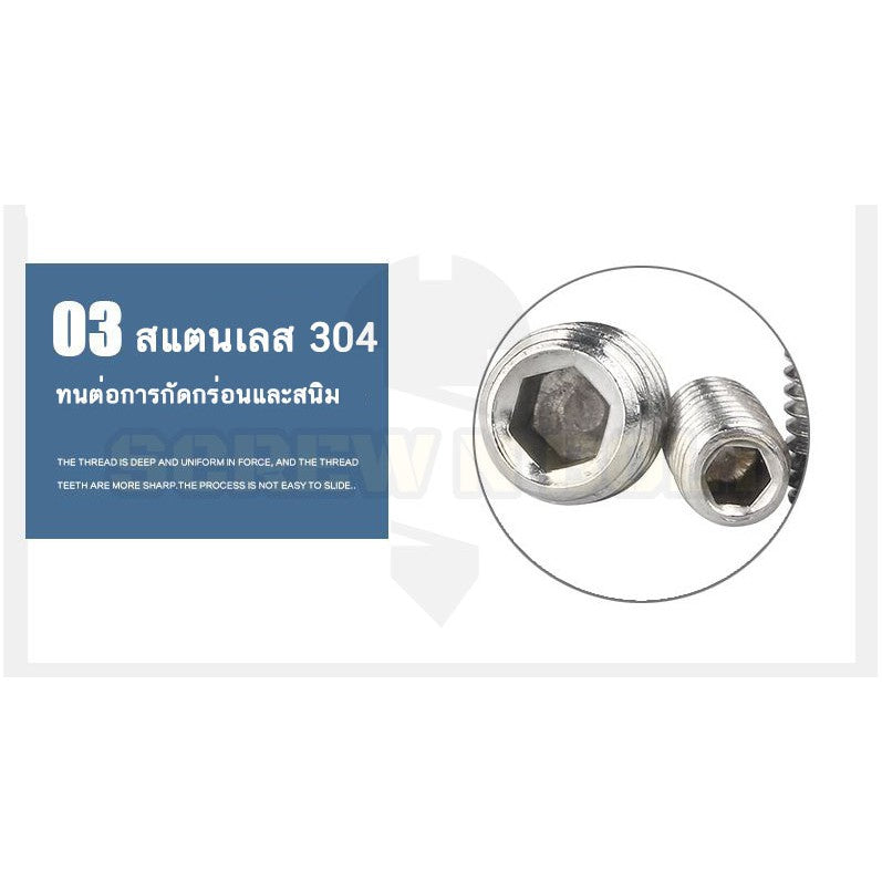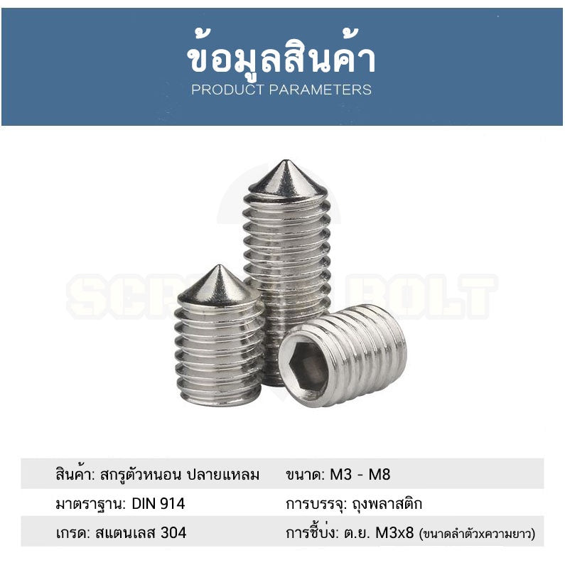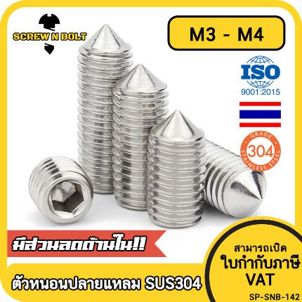 สกรู ตัวหนอน หกเหลี่ยม ปลายแหลม สแตนเลส 304 เกลียวมิล หยาบ M3 M4 / Hex Socket Set Screw w/ Cone Point SUS304 M3 M4