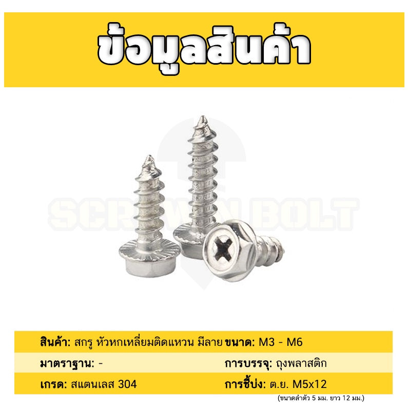 🔍 ชื่อรายการสินค้า : สกรู น็อต หัวหกเหลี่ยมติดแหวน ติดจาน แฉก มีลาย สแตนเลส 304 เกลียวปล่อย M3M4M5M6