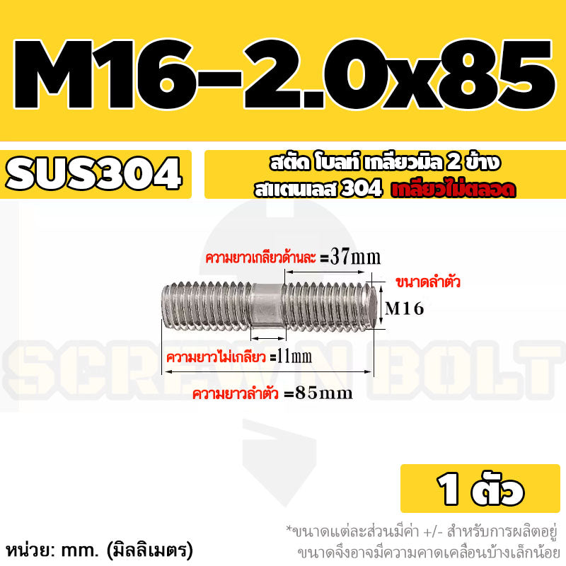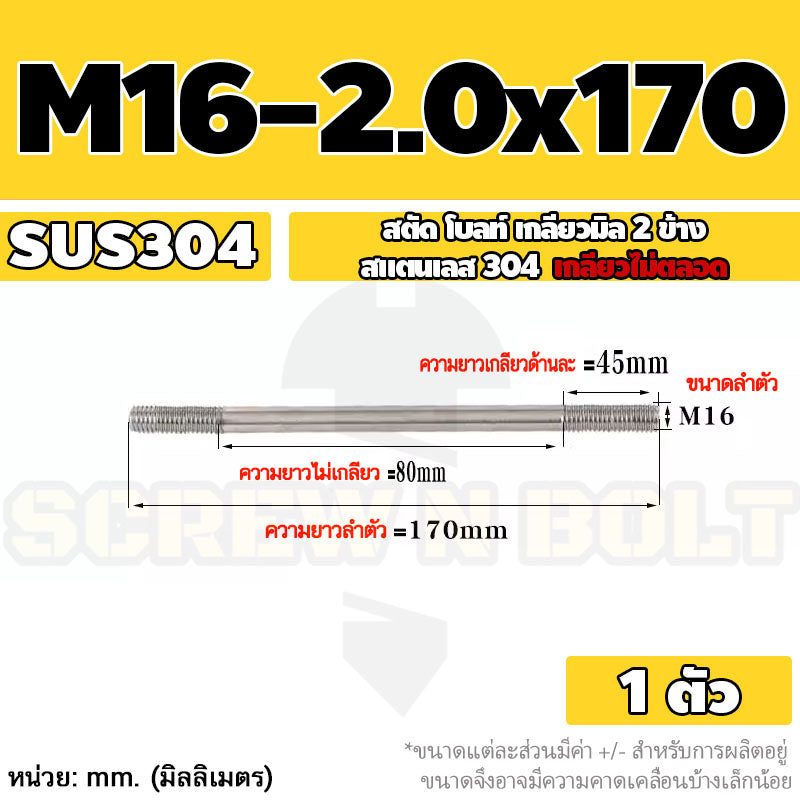 สตัด โบลท์ เกลียวไม่ตลอด สแตนเลส 304 เกลียวมิล 2 ข้าง M16 / 2 Thread End Stud Bolt SUS304