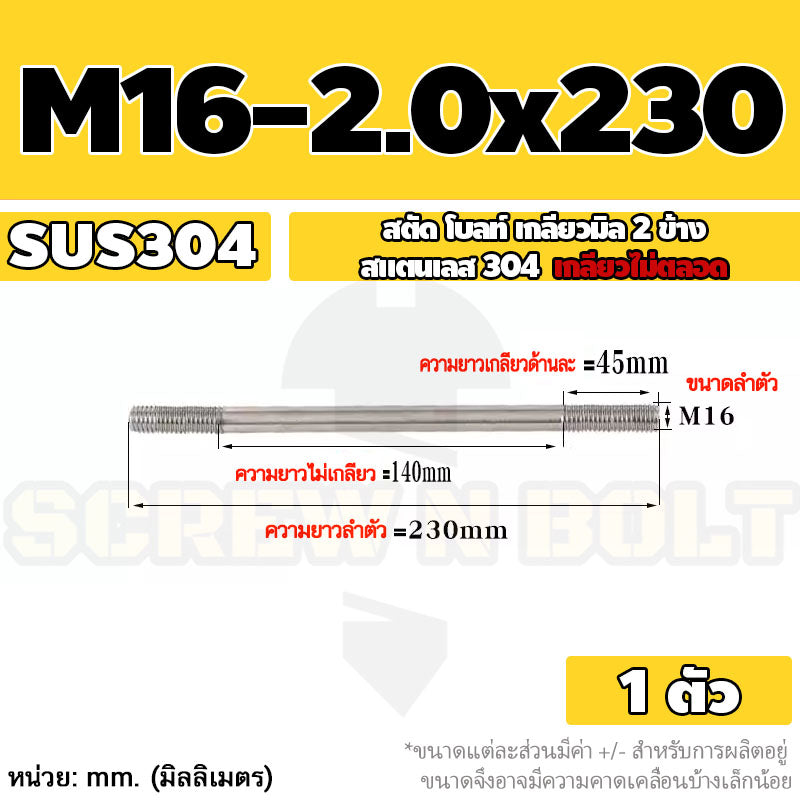 🔍 ชื่อรายการสินค้า : สตัด โบลท์ เกลียวไม่ตลอด สแตนเลส 304 เกลียวมิล 2 ข้าง M16