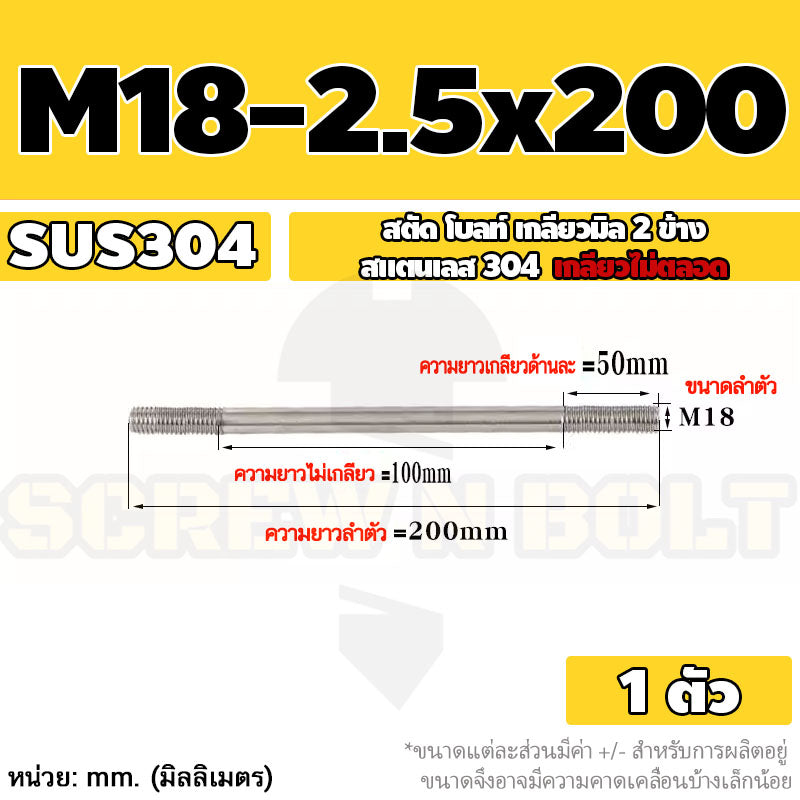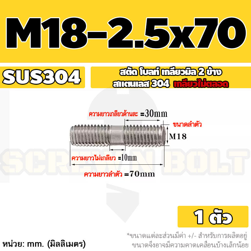 🔍 ชื่อรายการสินค้า : สตัด โบลท์ เกลียวไม่ตลอด สแตนเลส 304 เกลียวมิล 2 ข้าง M18