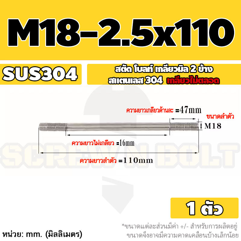 สตัด โบลท์ เกลียวไม่ตลอด สแตนเลส 304 เกลียวมิล 2 ข้าง M18 / 2 Thread End Stud Bolt SUS304