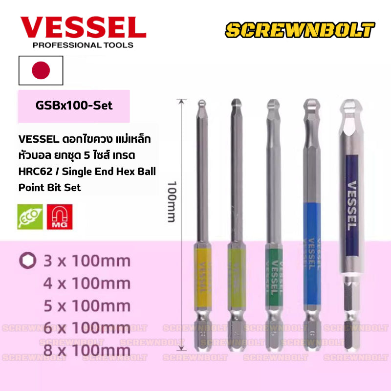 🟨 VESSEL ดอกไขควง แม่เหล็ก หัวบอล/หกเหลี่ยม ยาว 65/100/150 มม. เกรด HRC62 / Single End Hex/Ball Point Bit 🟨
