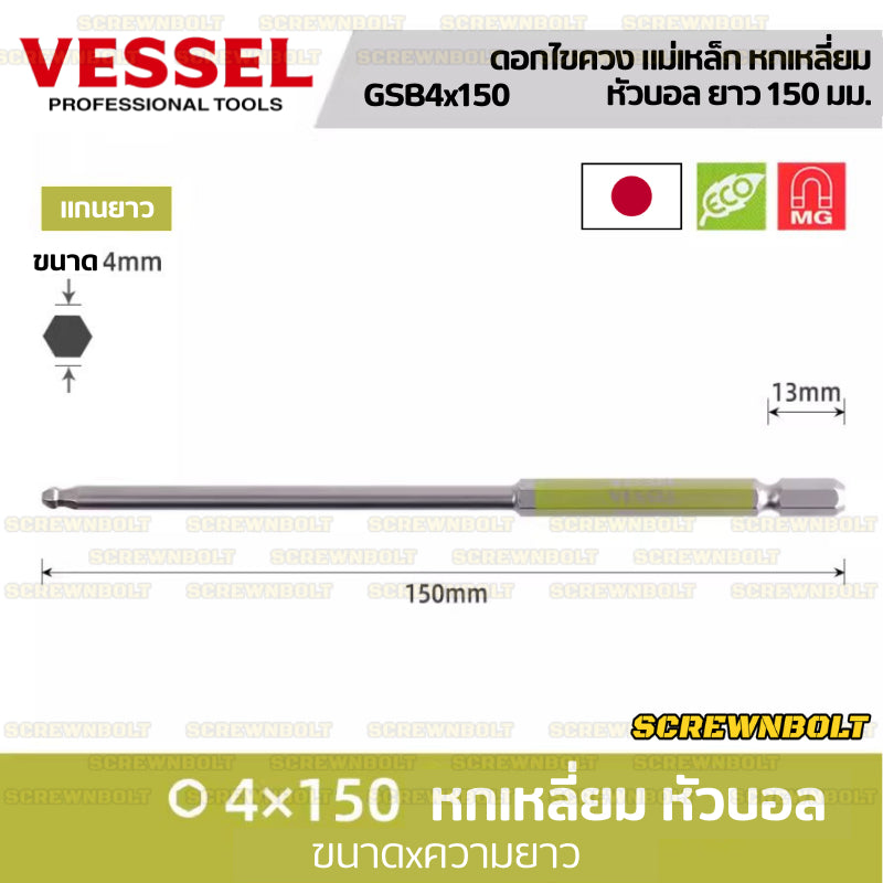 VESSEL ดอกไขควง แม่เหล็ก หัวบอล/หกเหลี่ยม ยาว 65/100/150 มม. เกรด HRC62 H2.5H3H4H5H6H8 / Single End Hex/Ball Point Bit