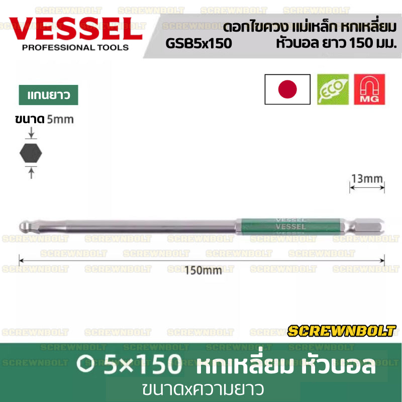 VESSEL ดอกไขควง แม่เหล็ก หัวบอล/หกเหลี่ยม ยาว 65/100/150 มม. เกรด HRC62 H2.5H3H4H5H6H8 / Single End Hex/Ball Point Bit