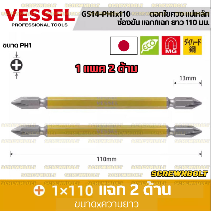 VESSEL ดอกไขควง แม่เหล็ก หัวแฉก/ปากแบน หลายความยาว เกรด HRC62 PH0/00/1/2/3 SL3/4/5/6 / Phillip/Slot Double Bit