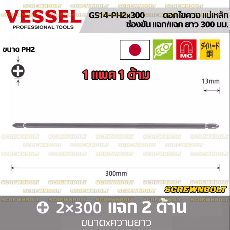 VESSEL ดอกไขควง แม่เหล็ก หัวแฉก/ปากแบน หลายความยาว เกรด HRC62 PH0/00/1/2/3 SL3/4/5/6 / Phillip/Slot Double Bit