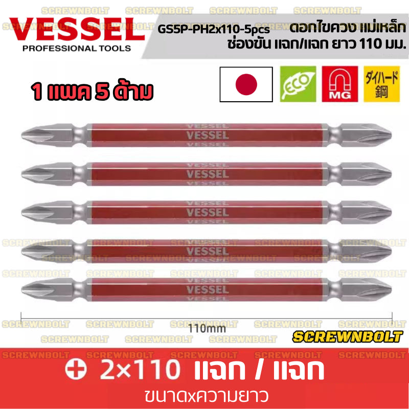 VESSEL ดอกไขควง แม่เหล็ก หัวแฉก/ปากแบน หลายความยาว เกรด HRC62 PH0/00/1/2/3 SL3/4/5/6 / Phillip/Slot Double Bit