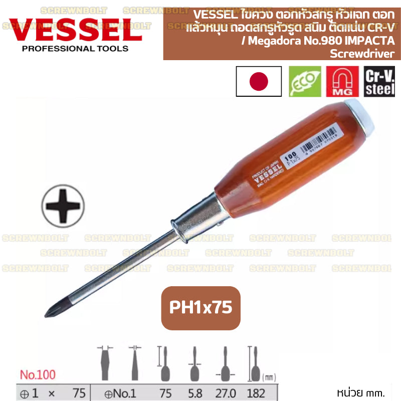 ✏ คุณสมบัติของ VVESSEL ไขควง แม่เหล็ก แบบตอกได้ แฉก/ปากแบน/+/- ไม้ธรรมชาติ สวย ไร้เสี้ยน / Powerful Tang-Thru Screwdriver No.100 ของ SCREWNBOLT ✏