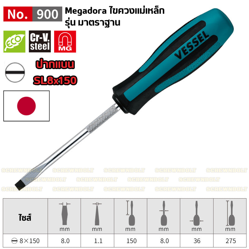 VESSEL ไขควง แม่เหล็ก Megadora ซีรีย์ 900 แฉก/ปากแบน กันลื่น ด้ามหนา/บาง/สั้น ปลายชุบแข็ง กันรูด / Screwdriver