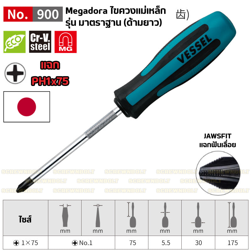 🟨 VESSEL ไขควง แม่เหล็ก Megadora ซีรีย์ 900 แฉก/ปากแบน กันลื่น ด้ามหนา/บาง/สั้น ปลายชุบแข็ง กันรูด / Screwdriver 🟨