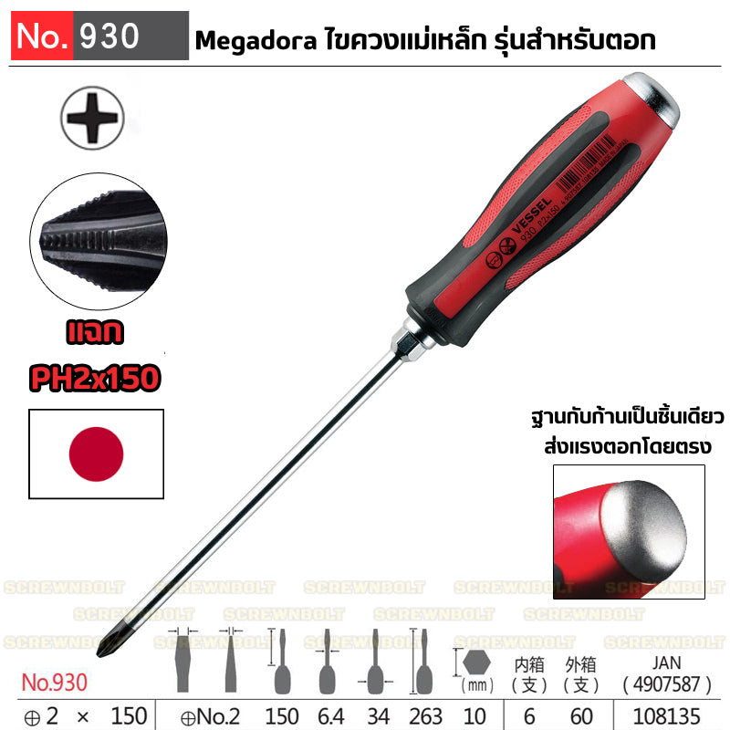 ✏ คุณสมบัติของ VESSEL ไขควง แม่เหล็ก Megadora แบบตอก แฉก/ปากแบน ของ SCREWNBOLT ✏